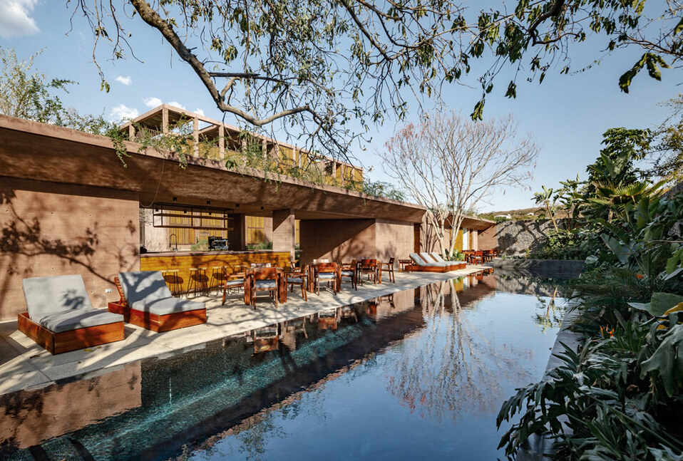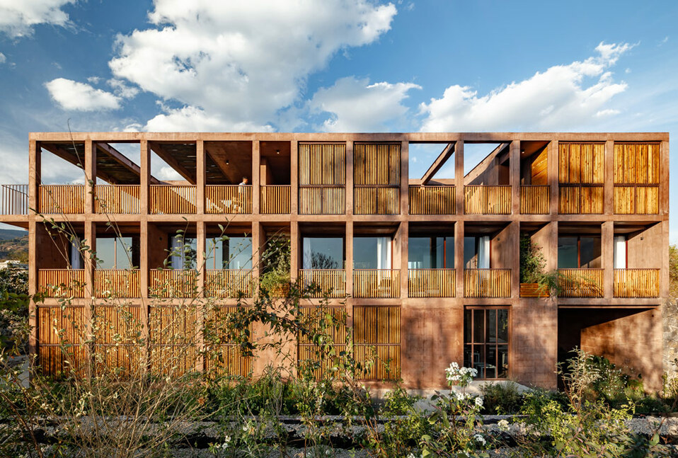 Esta colaboración exploró las virtudes de la zona, así como la topografía y vegetación para crear un hotel boutique con impresionantes vistas al cerro del Tepozteco. El proyecto está hecho a base de concreto pigmentado en tono terracota que se complementa perfectamente con la madera de sus ventanas y la vegetación. Y es precisamente este juego de elementos lo que hace tan interesante al hotel, provocando que sea visible desde lo lejos como un referente de la naturaleza.