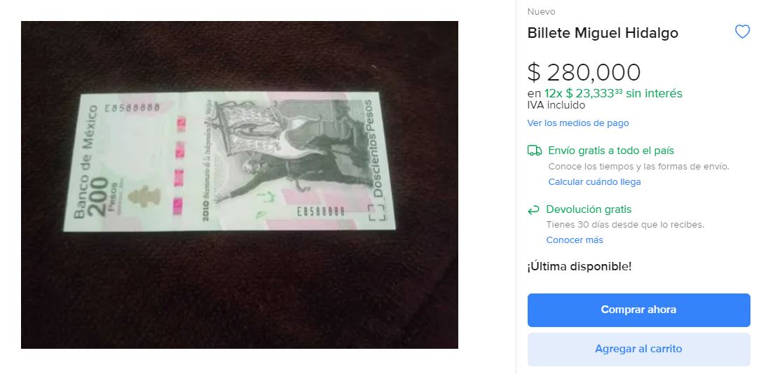 Esta pieza de colección cuenta con la imagen impresa de Miguel Hidalgo cargando el estandarte de la virgen María y se está ofertando hasta en 280 mil pesos en Mercado Libre.