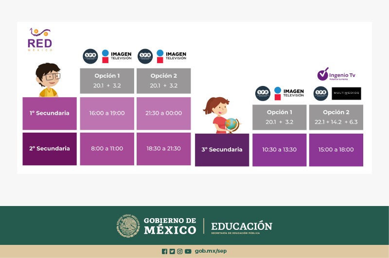 - Segundo Grado: Canal 20.1 y 3.2 en un horario de 8:00 a 11:00 (medianoche). Canal 20.1, y 3.2 en un horario de 18:30 a 21:30.