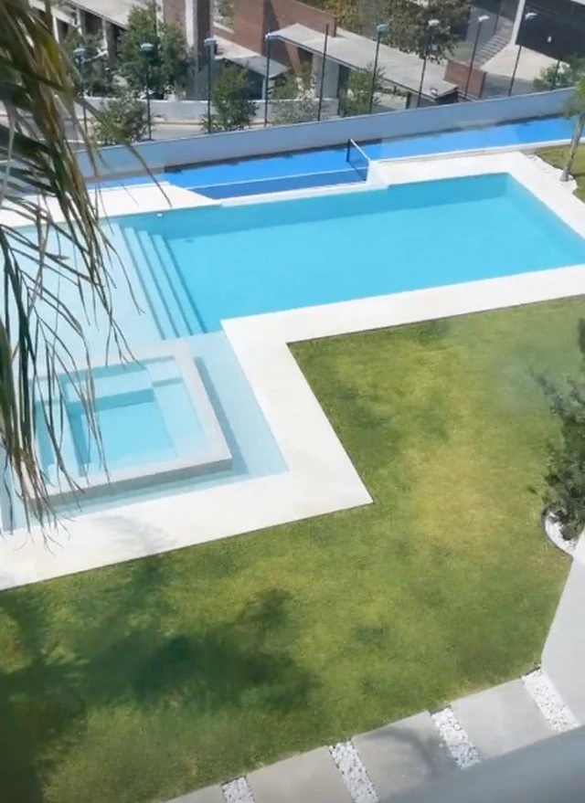 Por lo que podemos ver, es a través de la sala-comedor que hay una puerta deslizable hacia el patio y la piscina, la cual ha dado mucho de qué hablar cuando hubo escasez de agua en Nuevo León. Esta última es privada y no solo es un espacio para la pareja, sino también para sus perrhijos.