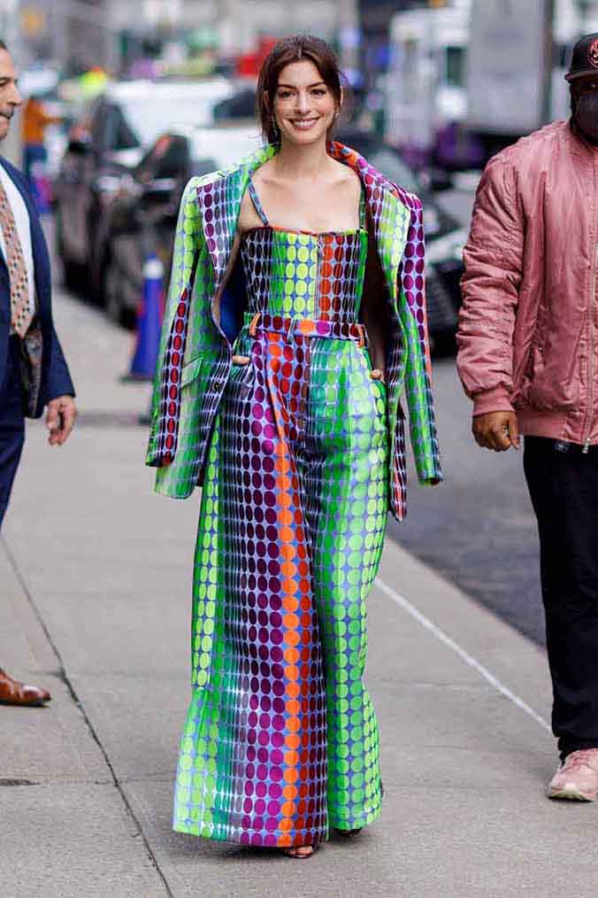 Durante su aparición en The Late Show con Stephen Colbert, Anne utilizó un palazzo conformado en la parte de arriba por un corset en tonos verdes, rojos y naranjas; una pieza que balanceaba a la perfección el street style y el print de la década de los setentas, según expertos de Harper’s Bazaar. Este conjunto fue una creación de Christopher John Rogers, diseñador que se ha convertido en una figura clave del mundo de la moda, y que también ha vestido a personalidades famosas como Michelle Obama, Kamala Harris, Lizzo y Rihanna.