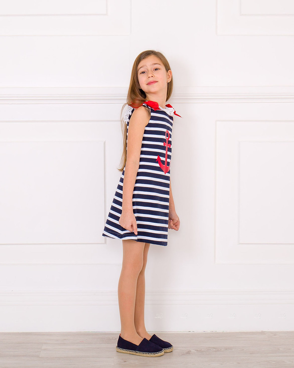 Para este estilo, las rayas horizontales de color azul en combinación con blanco son características. Tanto para niñas y niños este look será muy fresco y a la vez chic, úsalos con pantalón o short.
