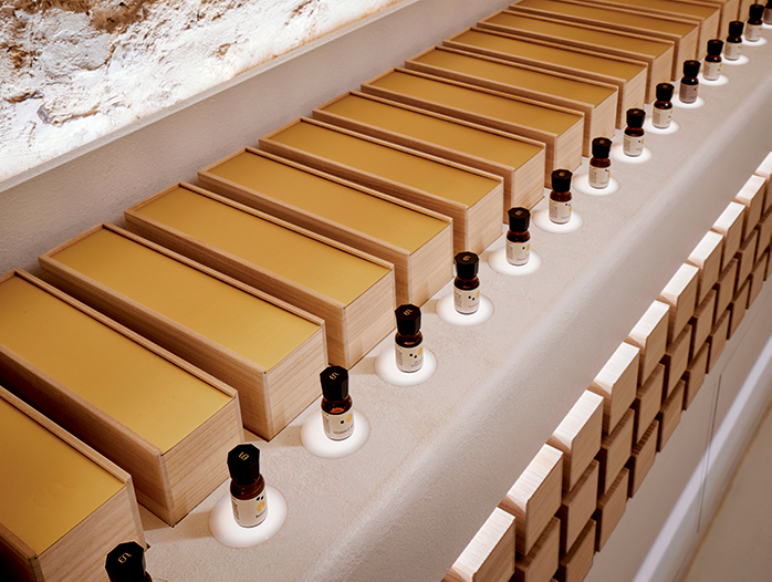 Sus paredes tienen terminación en forma de círculo para crear espacios internos más amplios, los que usan para asesoramiento, tratamiento, masaje y mezcla de esencias. Las superficies tienen un acabado en latón pulido para brindar un reflejo distorsionado, cálido y elegante.