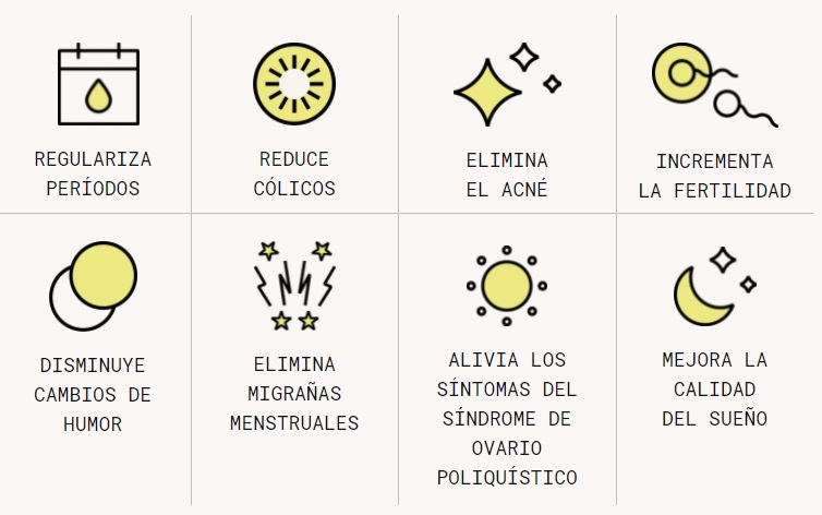 Algunos beneficios de tratamientos a base de semillas como Munar son que regularizan el periodo, reducen los cólicos y los cambios de humor, elimina el acné y las migrañas menstruales, mejora la calidad del sueño, favorece la fertilidad e incluso alivia los síntomas del síndrome del ovario poliquístico.