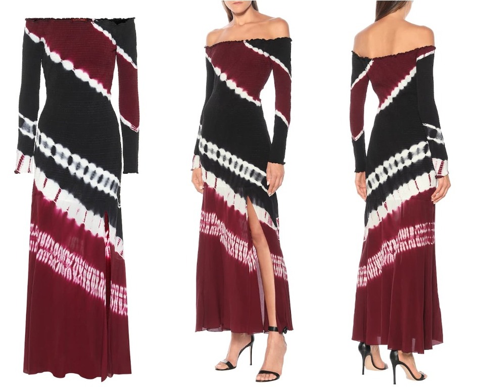 Adele ciertamente se veía positivamente resplandeciente dando vueltas con un vestido teñido anudado, que es de Altuzarra. Nos encantan los colores negro, blanco y burdeos, además de que la forma sin hombros es muy favorecedora.