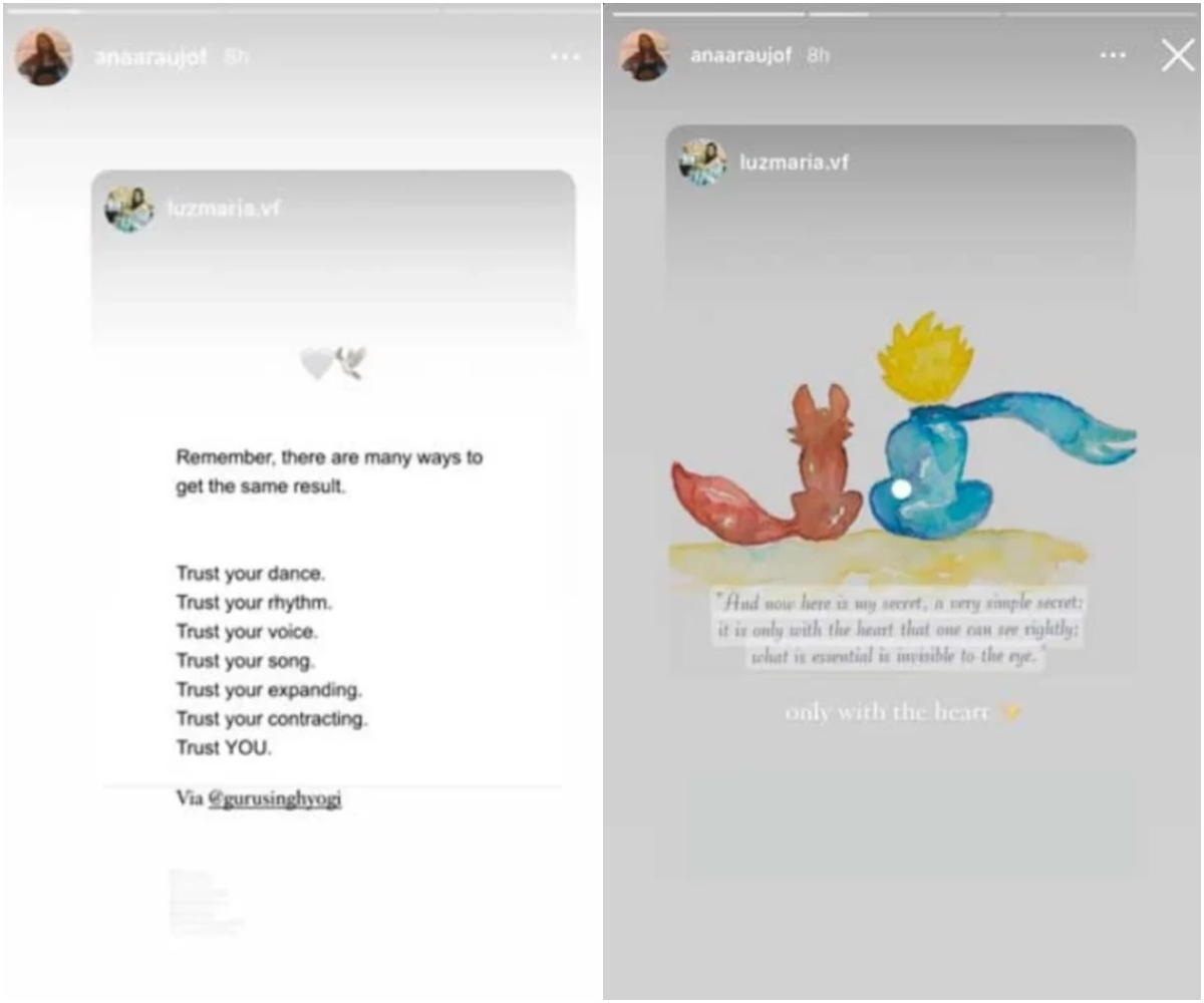 Las imágenes fueron compartidas por parte de otro usuario, pero Ana decidió retomarlas en sus historias de Instagram. Una de ellas cuenta con la frase: "Recuerde, hay muchas maneras de obtener el mismo resultado. Confía en tu baile, confía en tu ritmo, confía en tu voz, confía en tu expansión, confía en tu contratación, confía en ti".