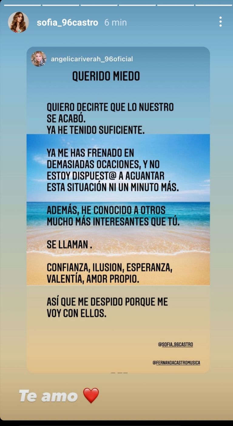Así que dejando atrás este episodio, todo parece indicar que Angélica Rivera regresará a los escenarios para conquistar a su audiencia y nuevas generaciones, al menos así lo deja ver este escrito que compartió en su red social, Sofía Castro con un “Te amo”.