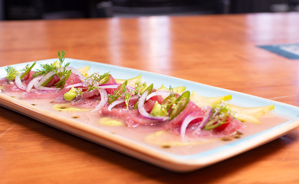 - La proteína que se ocupa para este platillo es el lomo de atún en láminas finas, acomodado de manera visualmente agradable en el plato, al cual se le coloca cebolla morada y un polvo de chile guajillo, pasilla y morita.
