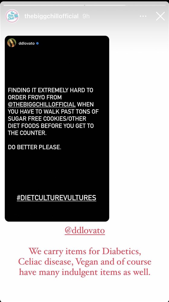 En una historia de Instagram posterior, Lovato publicó una captura de pantalla de una antigua publicación de Instagram en la que Bigg Chill etiquetó algunas de sus ofertas de galletas y pasteles como "libres de culpa". ("No necesito sentirme libre de culpa por comer algo", argumentó la nominado al Grammy).