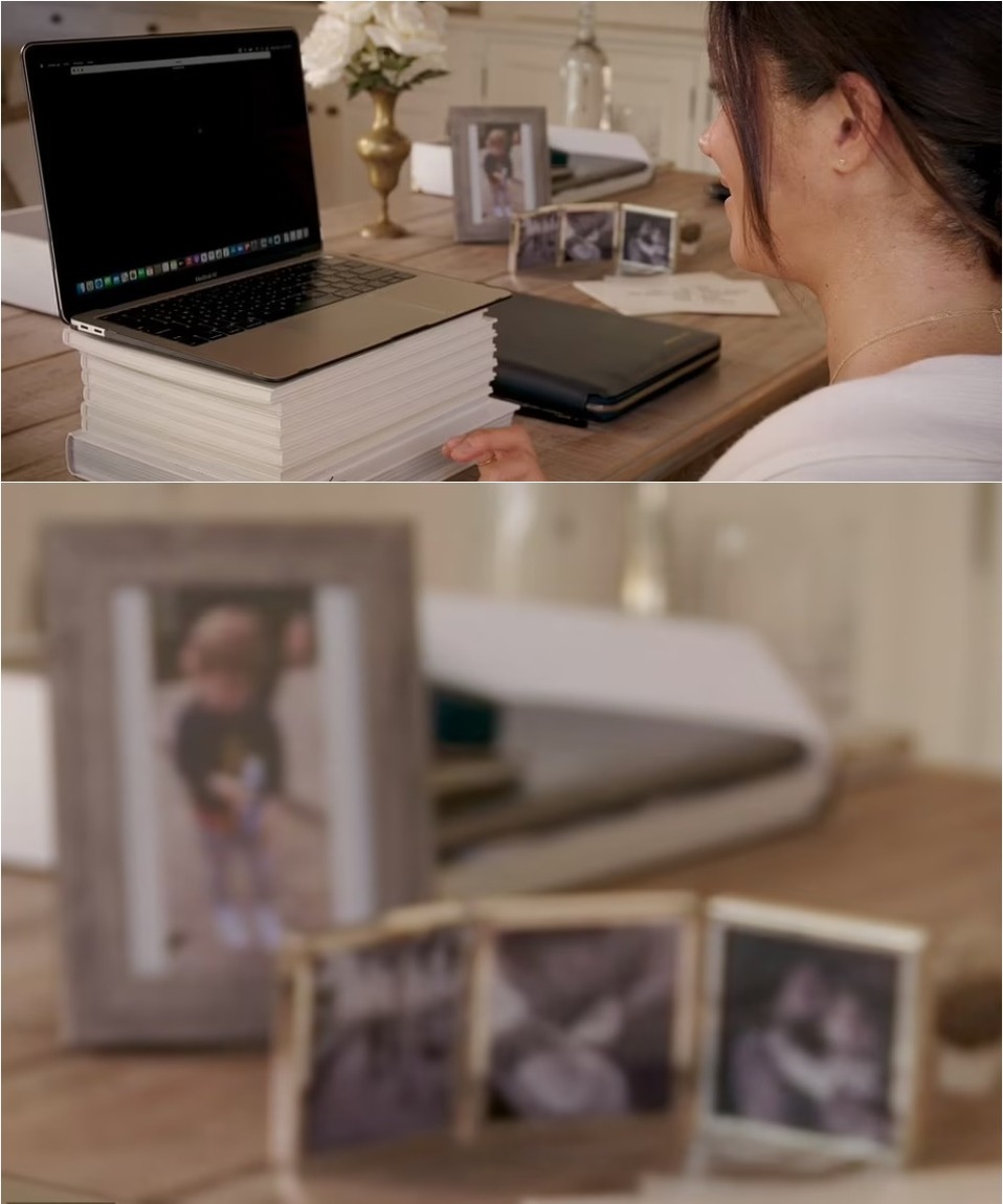 Además de la foto donde claramente se ve a Archie, también se podían ver otras 3 fotos en blanco y negro en un marco conectado, con la central que parecía mostrar a Harry besando a un bebé y una a la derecha mostrando potencialmente a Meghan sosteniendo a un niño pequeño.