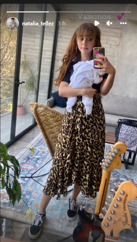 En su look llevó una falda larga con animal print, una blusa en color negro y tenis para andar cómodamente. En esta ocasión, a diferencia de su primera foto como mamá, Natalia llevó el cabello suelto y con su característico fleco, así como arracadas grandes, mientras que Emilia tenía un mameluco en color blanco.